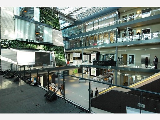 In het atrium is een groene muur opgenomen met stroken beplanting. Via trappen en glazen bruggen kunnen werknemers de verschillende kantoorruimtes rond het atrium bereiken.